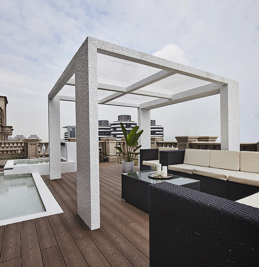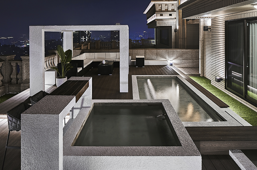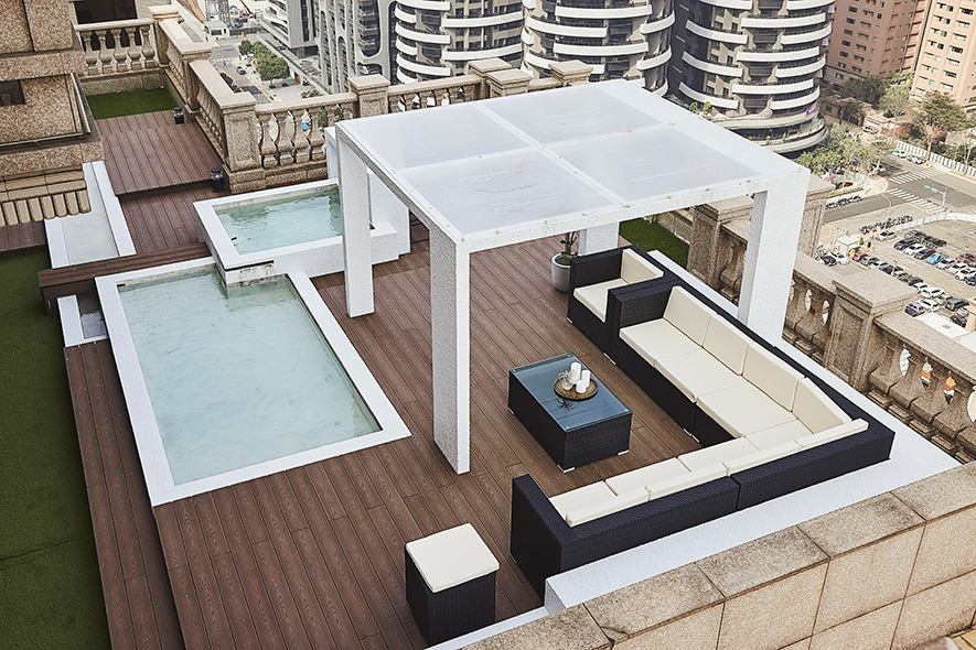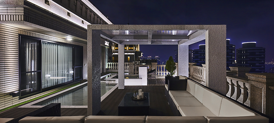 主要建材/ 義大利石英磚、煙燻榆木、台灣檜木、雪白銀狐、德國廚具、石頭漆、塑化木、仿韓國草、烤漆玻璃、鐵件、超耐磨地板、石皮、水流石、情控系統