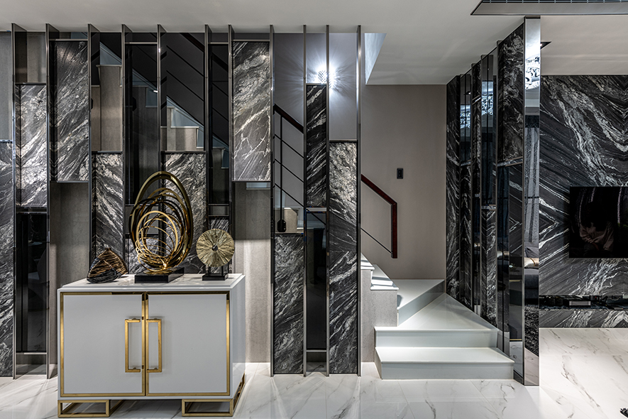 敞朗的透天大宅,以沈穩灰調為主軸,透過不同材質線條的豐富變化,建構豐富視覺、劃分場域動線。公領域中,運用大量石材,佐以鍍鈦鐵件,鑲嵌鏡面穿插其中,使整體視感更顯大氣奢華,並透過其反射質地,創造寬廣延伸的空間感受。私領域則以美感融匯機能,透過簡單的線面變化與色調配搭,形塑獨立的個性化空間,讓每一位家庭成員獲得歸屬。