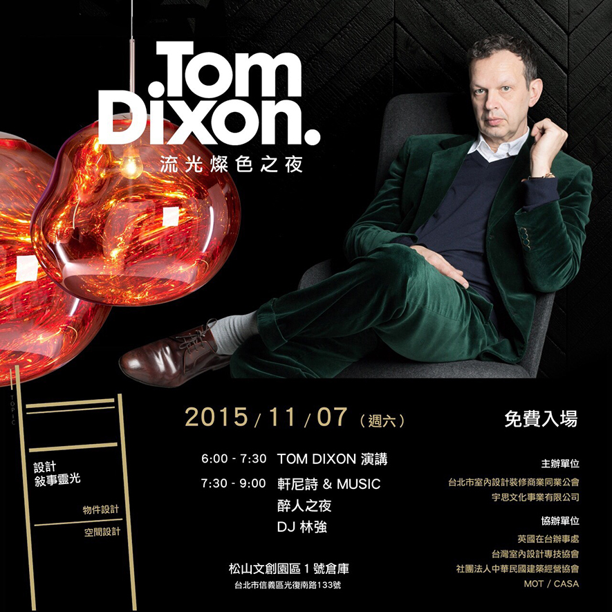 台北市室內設計裝修商業同業公會繼10月13、14兩日邀請全球最具知名10位設計大師國際論壇圓滿結束之後,11月7日(六)在台北松山文創園區1號倉庫,與宇思文化邀請極富盛名的英國設計大師Tom Dixon來台演講,有別於國際論壇的盛大,配和Tom Dixon的工業風調性,搭配軒尼詩及DJ林強的Party,提供設計師一個另類的設計師之夜。
