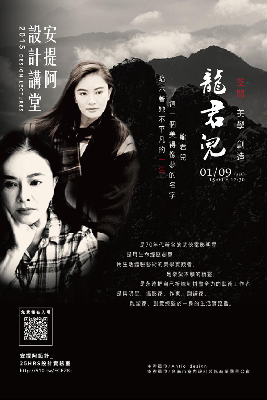 龍君兒,昔日電影武打明星,現在則是藝術創作者,她陪著四、五年級走過近百部的武俠古裝戲,在光環閃耀時卻毅然卸下螢光幕前的俠女形象,走進藝術創作的世界,開始綻放無限的創作可能,經歷人生中戲劇性的風風雨雨,不變的是她對藝術的嚮往及對美學的熱情,讓她在海峽兩岸藝術界嶄露頭角。105年1月9日,安提阿設計講堂很榮幸的邀請龍君兒至台南分享她對藝術永不止息的活力。