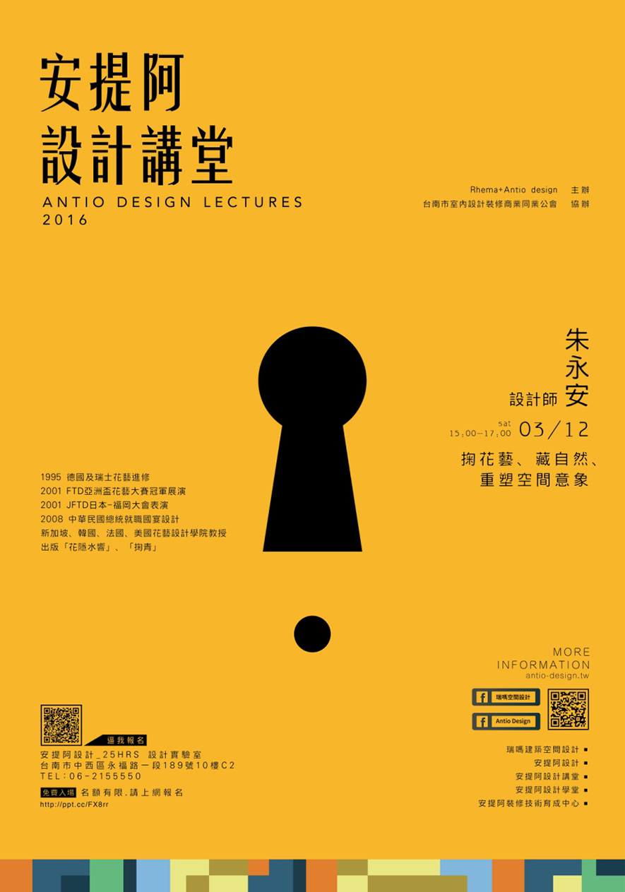 品花、玩花、惜花,朱永安是揚名國際的花藝大師,他富東方美學的內斂沉穩的創作,西方主義的抽象形體,讓花藝化為不朽的美學藝術,安提阿設計講堂將於3月12日邀請朱永安大師闡述花藝背後的故事及美學,更會在現場進行花藝展示表演,機會難得,歡迎朋友們共同參與。