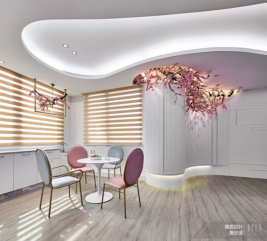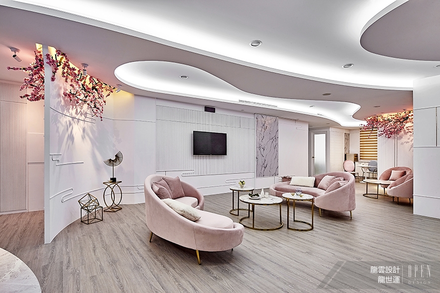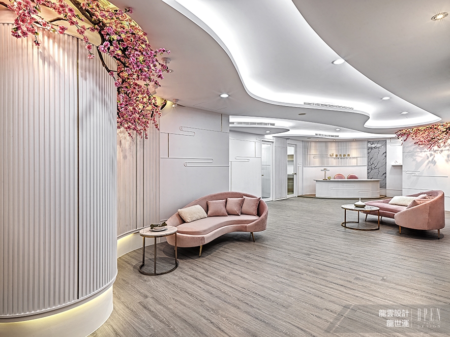 以「無框架設計」聞名的龍總監,靈光乍現浪漫主義詩人李白的《清平調》詩詞:「雲想衣裳花想容,春風拂檻露華濃。」將空間色彩用以粉、白配色,並搭配東方吉祥象徵「雲紋」,讓醫美診所流淌雲彩、綻現桃花林木,跳脫大眾對於診所的既定印象。