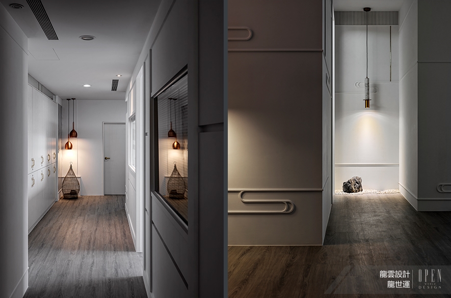 隨著雲紋曲線流動,搭配寧靜的燈光有序地點亮各角落,在廊道可見設計師細膩地以東方式園林造景,點綴著「桃花林木」裝飾,或選用古典垂吊燈映照著木鳥籠,整體光氛充滿意境攫取目光。