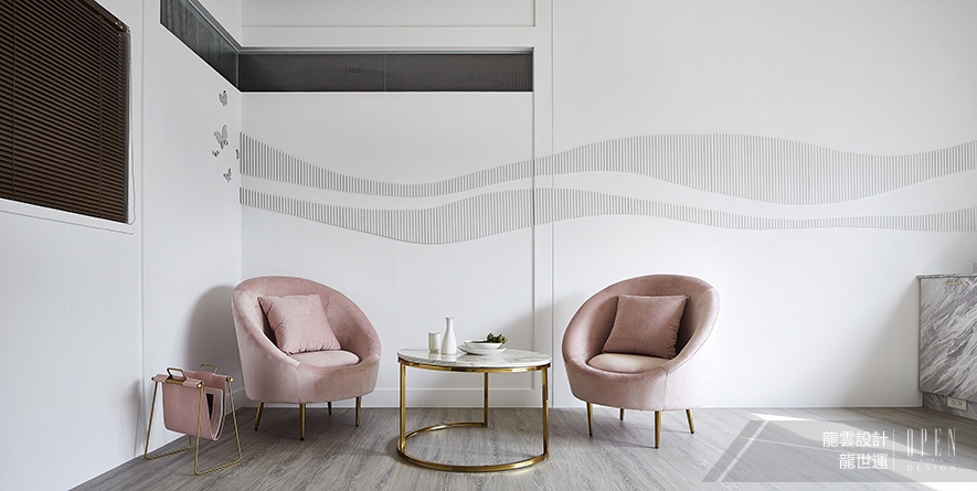 明亮的潔白牆面配上自然灰石紋鋪底,以「雲紋」流線造型延展視野,流動的立面設計,除了確保隱私,亦減少不必要的空間浪費,放大空間坪效與視感。風格情境援引自陶淵明《桃花源記》中的桃花景緻,林木花瓣伴隨燈光於角落顯現倒影,格外添增東方韻味。