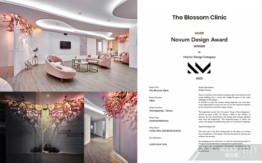 將古典詩句「雲想衣裳花想容,春風拂檻露華濃」的美好意象,具象為空間規劃呈現,龍雲設計 龍世運 設計總監 的商空作品《花想容》,以舒適且賞心悅目的醫美診療間,一舉奪得「室內空間」銀賞大獎,為品牌在國際間打出響亮名號!