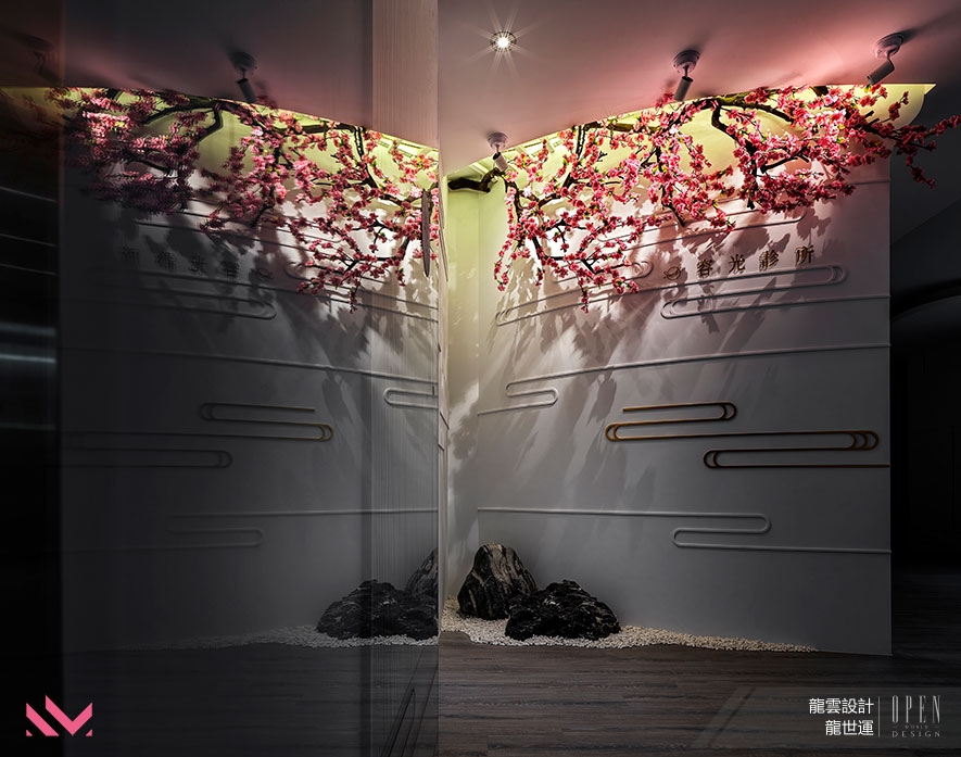 ▲廊道處一方庭園攫取目光,將東方微縮式的園林景觀,移至室內運用桃枝、桃花點綴其上,寧靜的光氛使人在就診過程中,感到更加舒適平和。