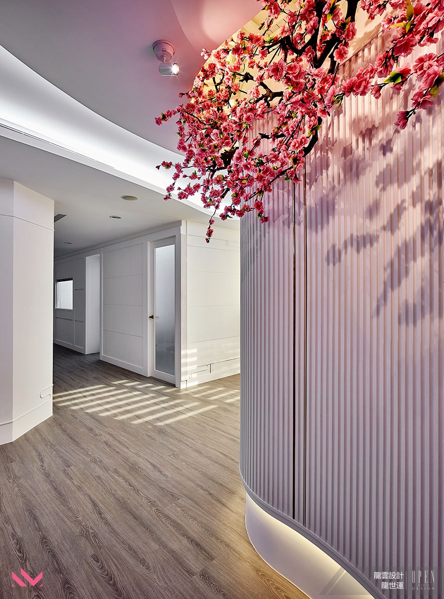 ▲天與壁的呈現,以東方的如意雲紋表徵,恣意流淌,搭配光線照明,柔美綺幻。佐以陶淵明《桃花源記》中的桃花林木點綴其間,意喻美好生活,繽紛燦爛,賓客至此,皆能感受靜逸氛圍,以達到身心靈的舒緩放鬆。